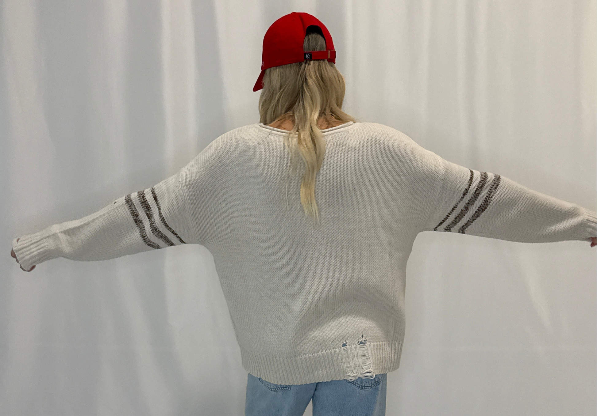 Stay effortlessly stylish with the Varsity 80 Distressed Knit Pullover, featuring vintage-inspired distressing and a comfortable knit fabric for enduring wear and classic appeal. Oversized fit.